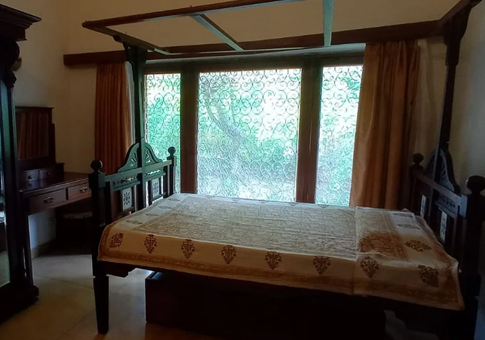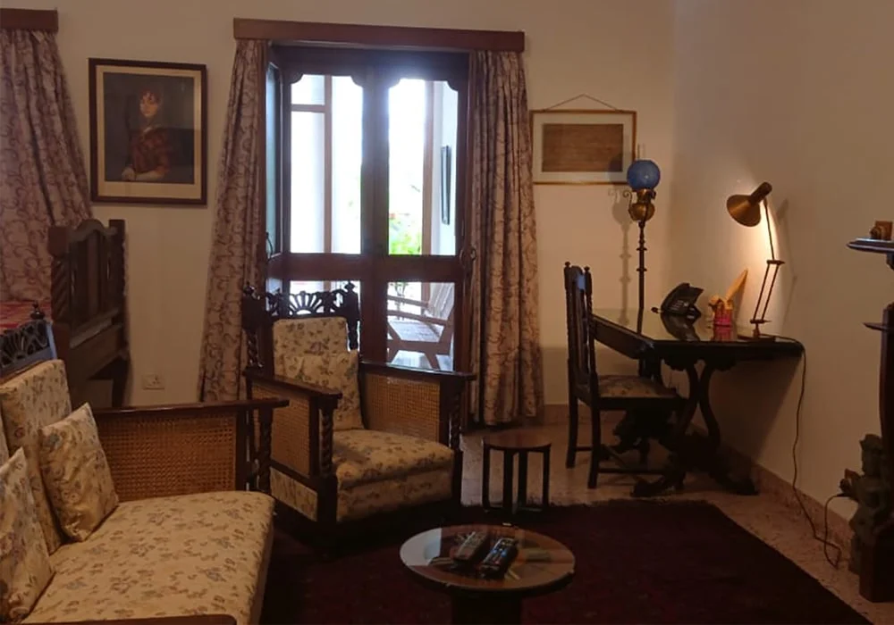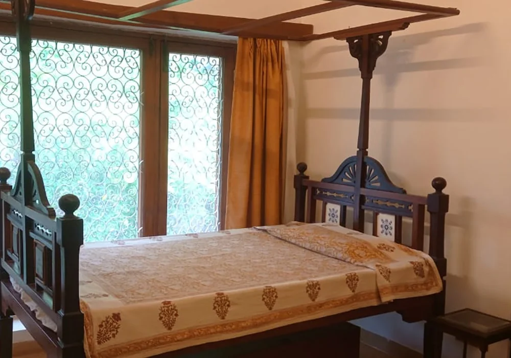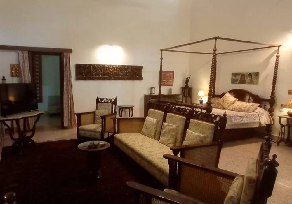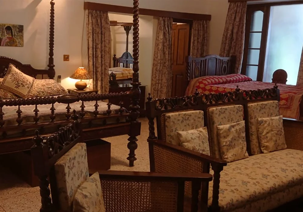 Welcome to the opulent Maharaja Suite at Gulnaar Villa. This classic room is part of the original architecture of Gulnaar Villa. Featuring lavish furnishings, including majestic four-poster beds, a regal fireplace, soaring ceilings, and a curated bookshelf, this suite offers an unforgettable experience fit for royalty.
